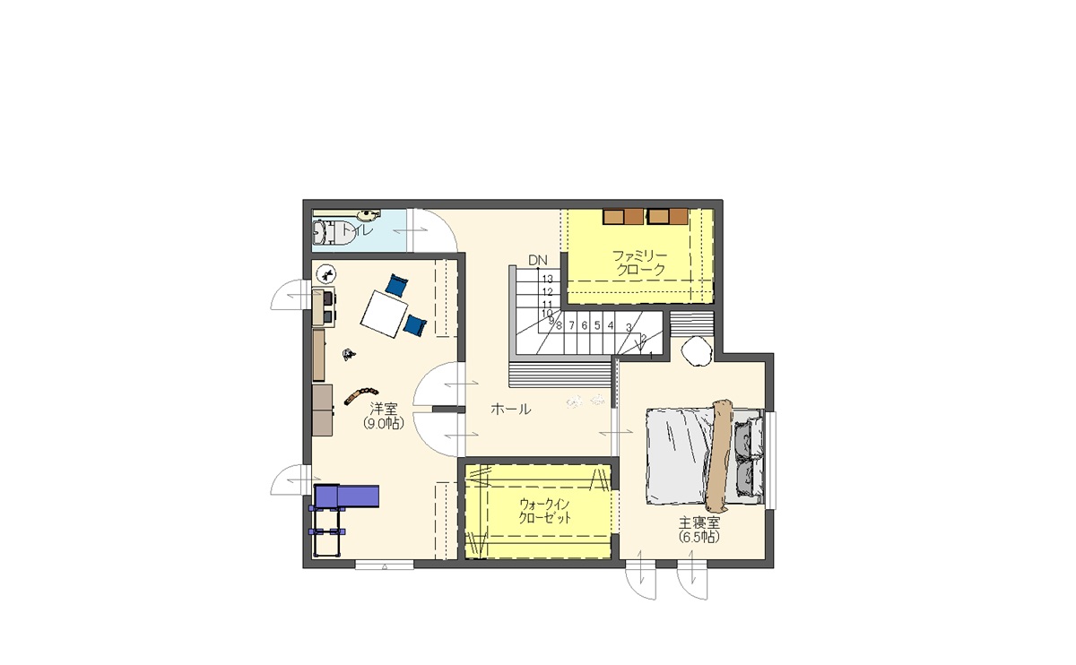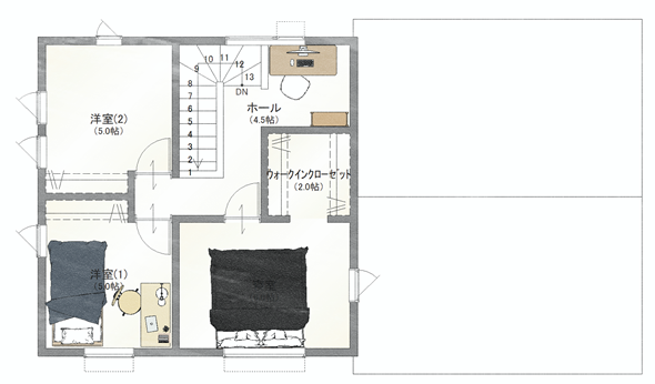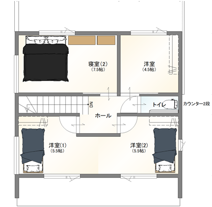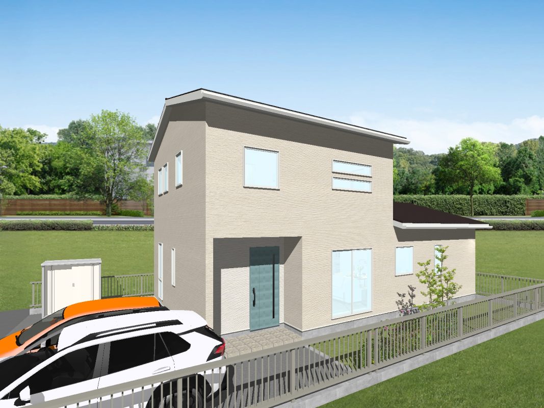 家族人数が多いご家庭や、親御さんとの同居を想定した5LDK・34.75坪のゆとりあるプランです。 個室をしっかり確保しながら、生活の中心となるLDKは家族が自然と集まれる配置に。 浴室は 1.25坪タイプ、トイレも将来を見据えてゆとりを持たせた設計としました。 回遊動線を取り入れることで、毎日の家事や移動もスムーズに。 「今も、これからも暮らしやすい」を考えた住まいです。