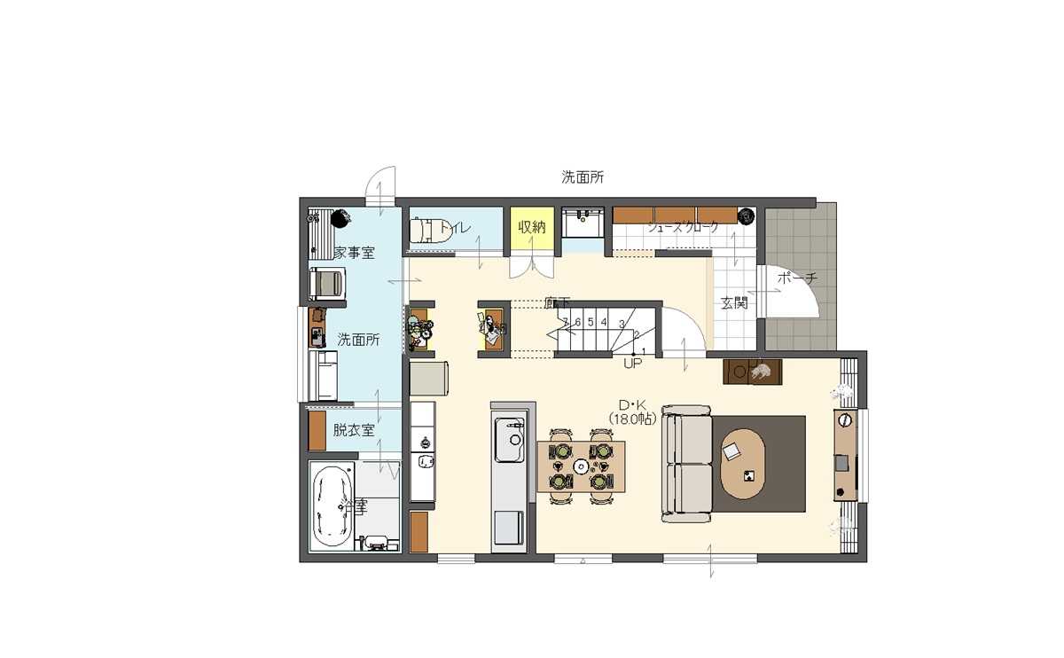 吹抜と高窓で明るい開放的な空間の半平屋 家族のプライベートも確保しながら、 家族を近くに感じられるプランです! 洗面・家事室・ファミクロの流れが 家事効率をUP!