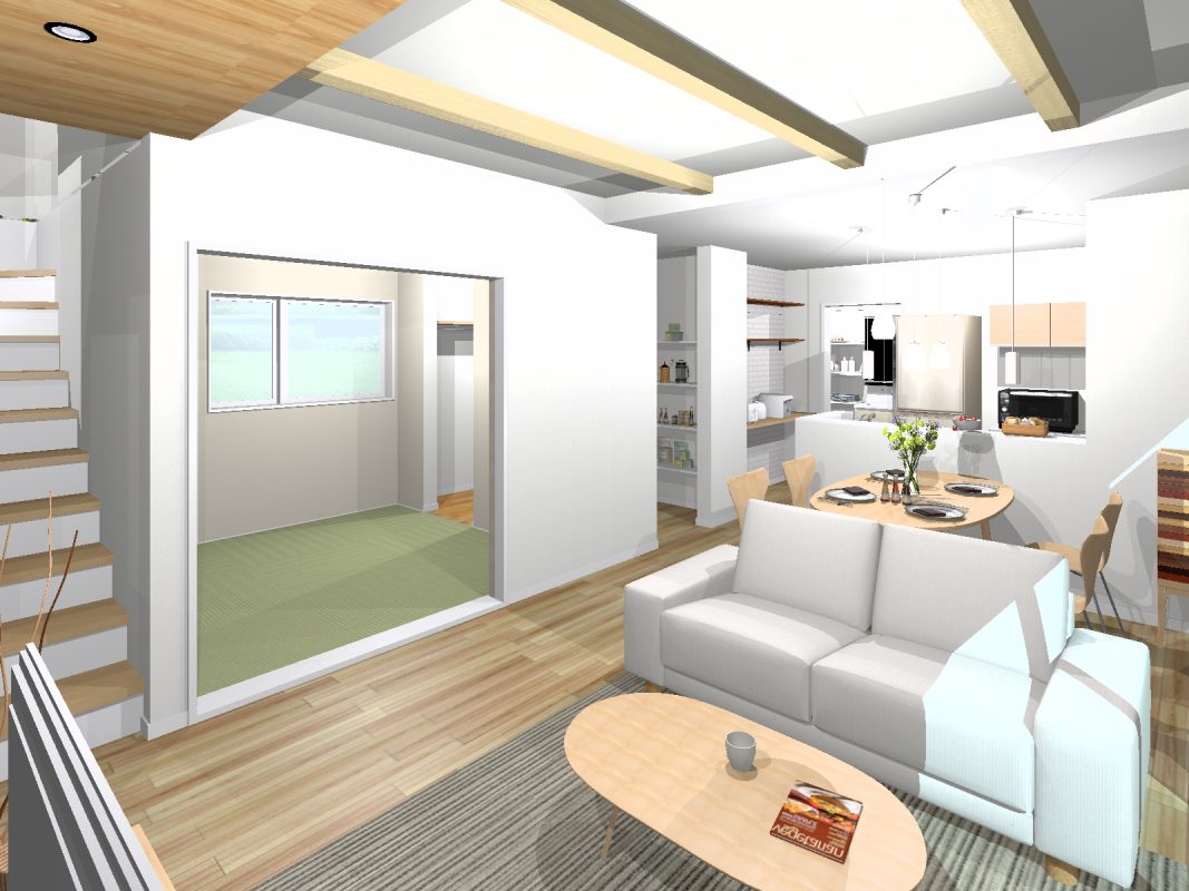 玄関からシューズクローク、パントリーへの動線は人気の秘密。 横並びのキッチンも、使いやすさ抜群。リビング横の和室もポイントです。