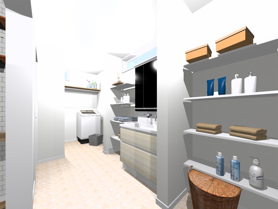 3LDK+和室スペースのある平屋 洗面+家事室で、家事を楽するアイテム ガレージ付きで、雨でも雪でも、濡れずにお家に入れますよ