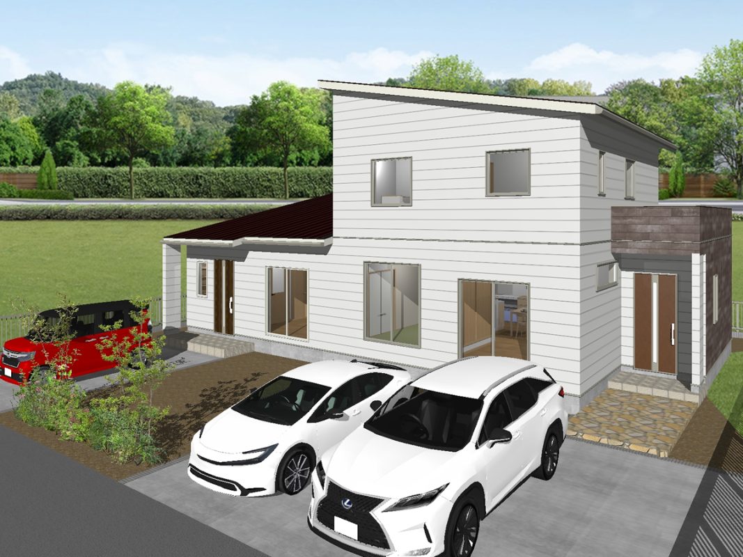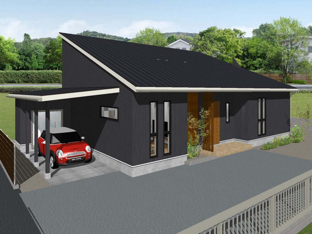 共働きの30代ご夫婦とお子さま2人の、今の暮らしにちょうどいい平屋プラン。 外観は、ブラックのガルバリウム鋼板×木質サイディングの組み合わせで、シャープかつ温かみのある印象に。 スタイリッシュな中にも、家族らしい優しさと落ち着きを感じられるデザインです。 また、南側には大開口のサッシを採用し、明るさと開放感もたっぷり。 自然の光と風を感じながら、心地よく過ごせる毎日を実現します。 効率的な家事動線や、家族のつながりを大切にした間取り構成で、忙しい日々もスマートに、楽しく暮らせる一棟です。