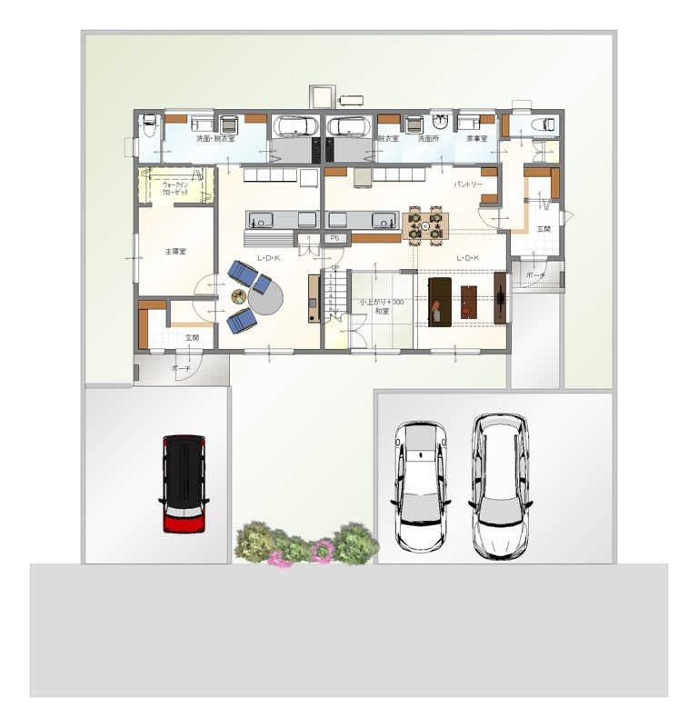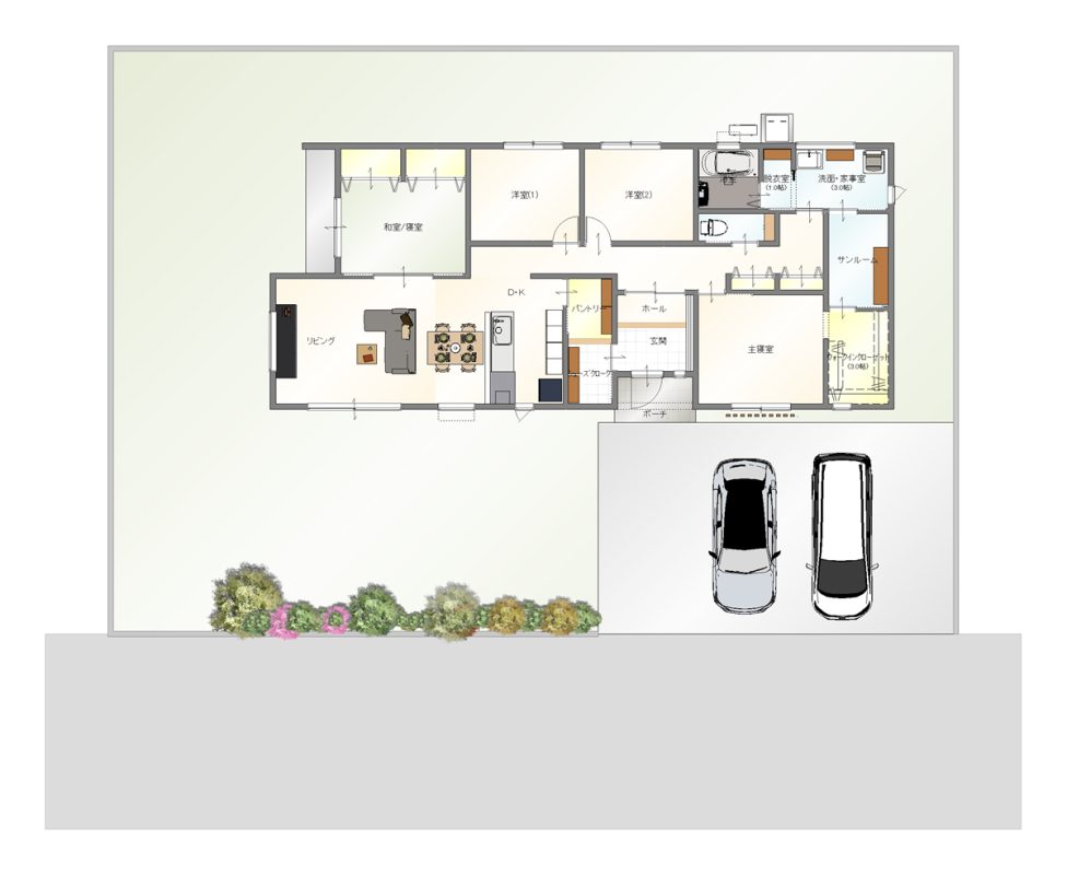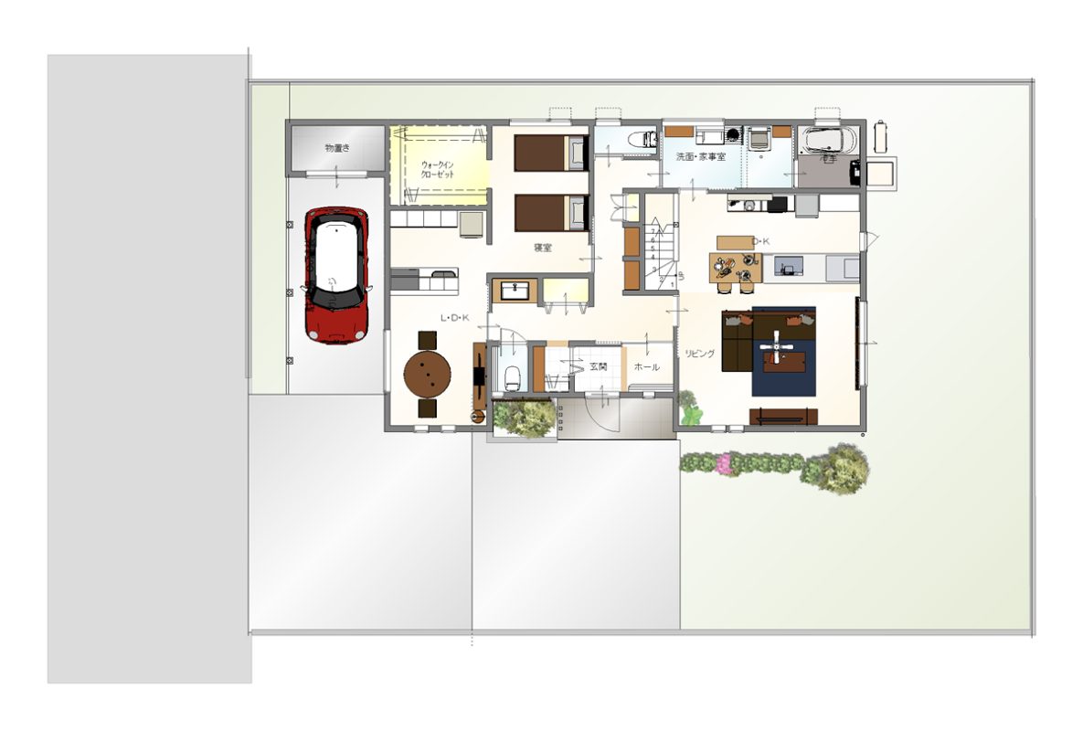 自然と外へ出たくなるような、のびやかなアウトドア空間を楽しめる平屋プラン。 ゆるやかに庭とつながるLDKは、家の中にいながら外の心地よさを感じられる開放感ある設計です。 屋根付きの土間ガレージは、雨の日も安心な駐車スペースであると同時に、収納・DIY・趣味空間としても大活躍。 家族の“好き”を思いきり楽しむための、自由時間のベースになります。 おうちキャンプ、BBQ、テント、家庭菜園…。 「外で楽しむ」が毎日の暮らしに溶け込む、アウトドア好きなご家族にぴったりな一棟です。 ※建物面積にガレージ分は含んでおりません