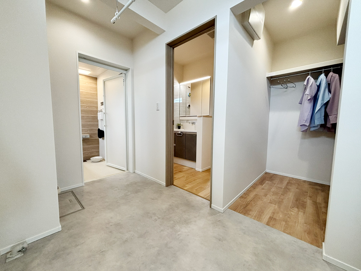 室内干しを備えた家事室からは、洗面室、 ファミリークローゼットへと繋がるスムーズな回遊動線。