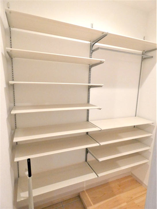 (2)シューズクローゼットは、好きな高さに設定できる棚板と、パイプハンガーをセットにしました。