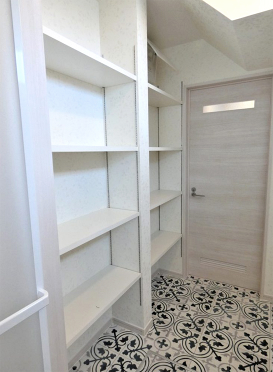 突き当りの可動棚には、家族みんなで使うような共有物を置けます。探し物の度に、誰かを呼ばずに済むかもしれませんね!